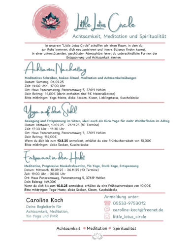 Übungen kennenlernen, die Verspannungen durch viel Sitzen lösen.Plätze: 8Kosten: 19,- € Termin: 25.Oktober 202516:30 - 18:30 UhrLeitung: Andrea Litterscheid